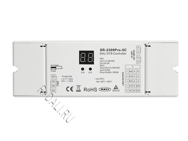 SR-2309PRO-5C is a 7 in 1 professional multi-addresses enabled DALI DT8 control gear which is compliance with IEC 62386-101:2014, IEC 62386-102:2014, IEC 62386-207 Ed2, IEC 62386-209:2011. It is DALI DT8 device with built-in DALI-2 interface. Multi addresses are enabled in this control gear, which means it integrates multi DALI DT8 devices in on control gear. It can be set as single address type or multi-addresses type. The combination of device types can be configured with the buttons and display, and total 7 combinations available: Tc, RGBWAF, XY, 2*Tc, XY+Tc, RGB+Tc, XY+W (DT6).