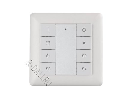 Push button DALI panel SR-2422K8-DIM-G1-S4 is a single color DALI controller that controls 1 group address and 4 scene addresses. The group of devices on DALI circuit and scenes to be controlled can be assigned manually by 2 rotary switches on the back. All DALI devices on the circuit can be controlled by the panel through broadcast. The DALI panel enables to switch on/off and increase/decrease light intensity of the selected group. 4 predefined or saved scenes can be assigned and recalled to the selected group. The saved scenes will cover the predefined ones. It is easy to use and no configuration by computer required. The DALI controller can be compatible with all universal DALI master controllers. Compatible with existing standard size frames from Berker, Merten, Gira, the DALI push button controller can be wall mounted easily.