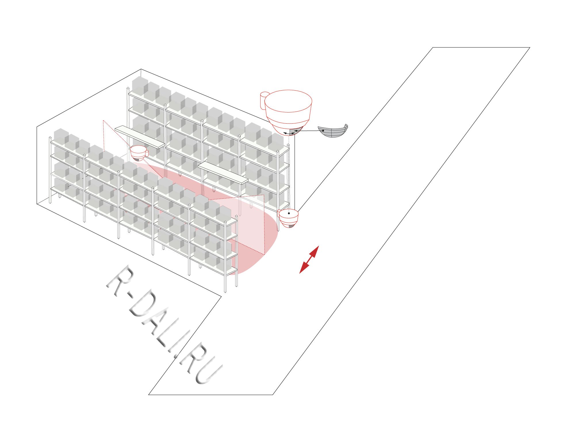 When used in high-bay warehouses, care should be taken that, in the cross-aisles of the warehouse, detectors are installed that can detect movement only in the desired aisle locations, by using blinds or other technical arrangements.
