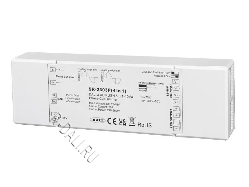 SR-2303P(4 in 1) is a multifunction UL & CE approved LED dimmer with DALI, Push, Phase Cut, 0/1-10V 4 dimming interfaces in 1. It is designed with dip switch to select different dimming interfaces. The LED dimmer has 1 channel 12V/24V/36V/48VDC constant voltage output which can support up to 20A. It is designed with 12-48VDC input. This phase control LED dimmer supports both leading edge and trailing edge dimming input and can be compatible with universal phase cut dimmers. The DALI LED dimmer complies to DALI standards IEC 62386-101, IEC 62386-102, IEC 62386-207 and match all DALI systems in the market. While selecting 0/1-10V interface, it can be Compatible with universal 0/1-10V dimmers.