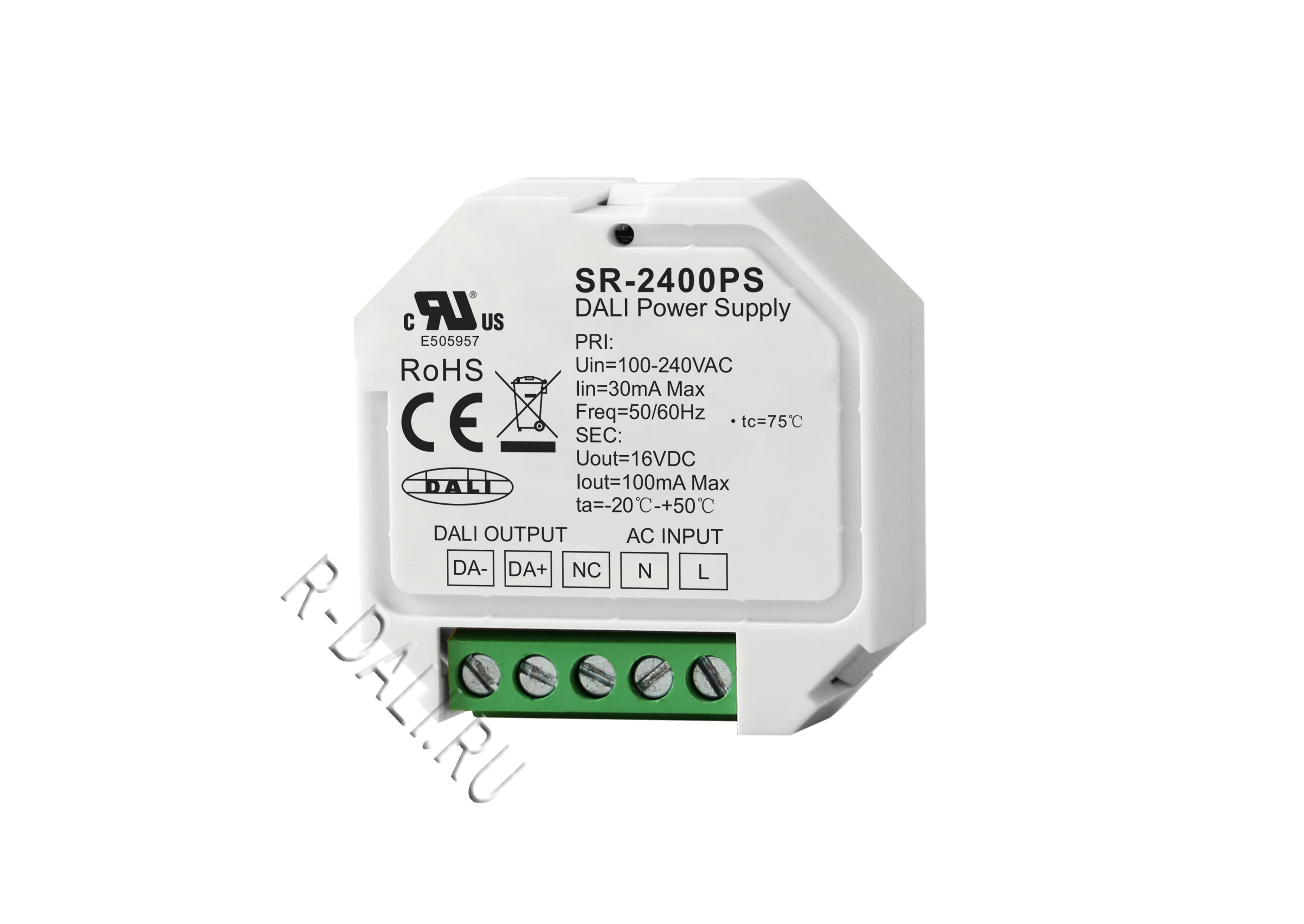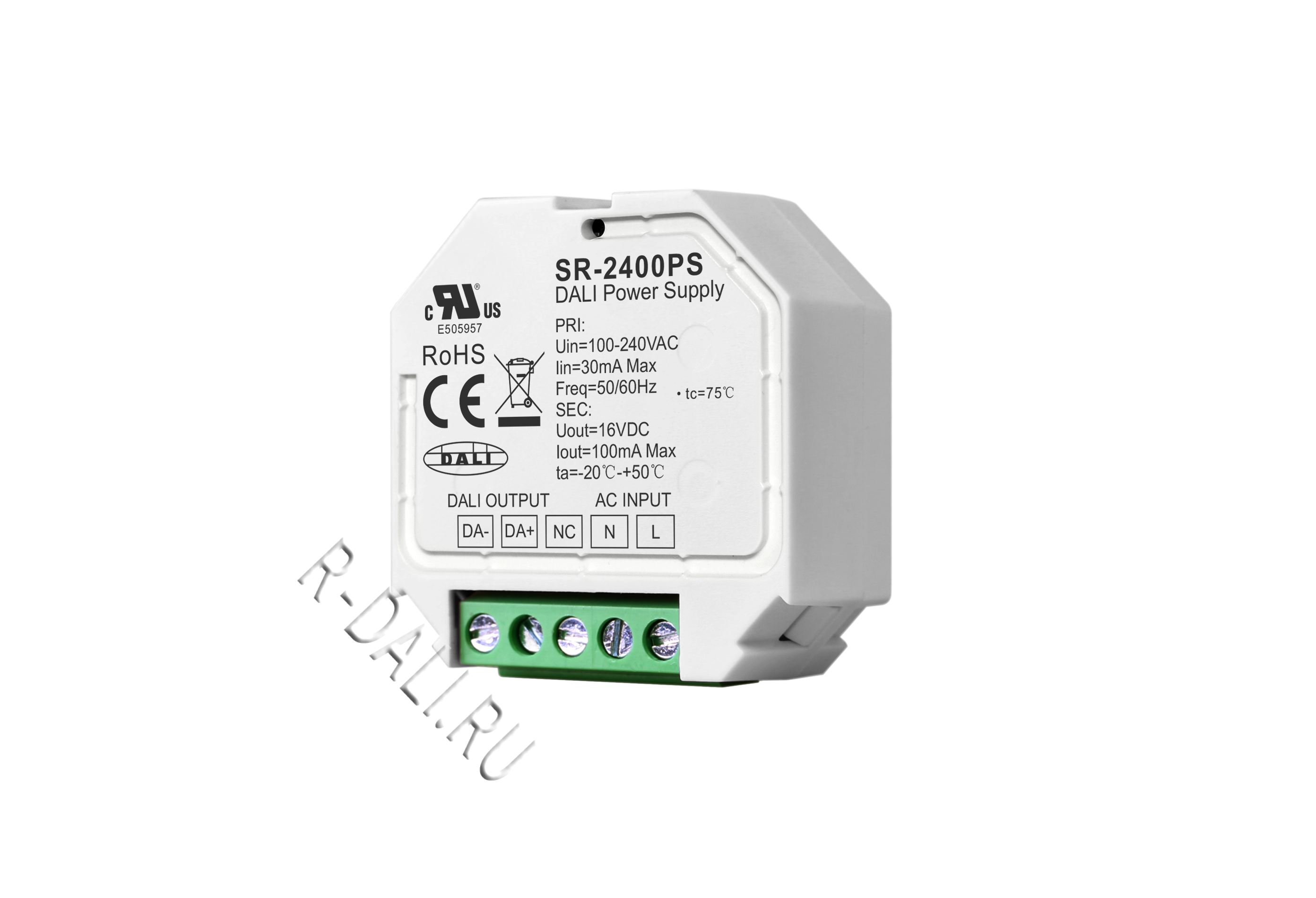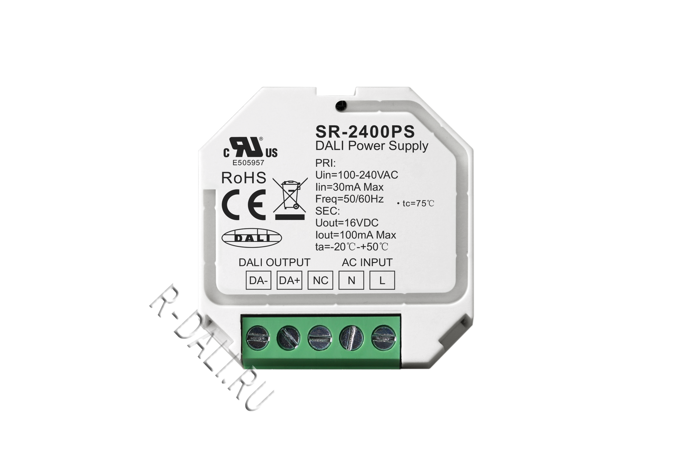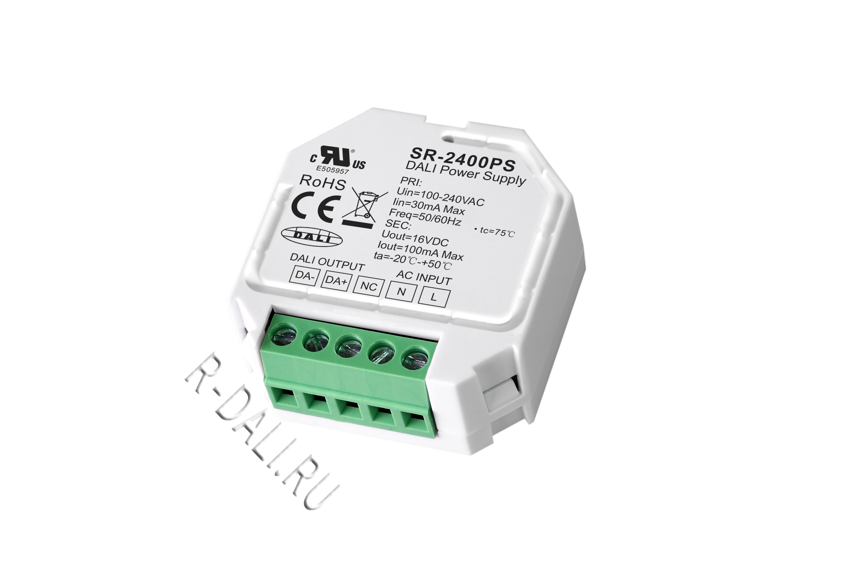 SR-2400PS is a universal DALI power supply designed with compact size and wide range input voltage 100-240VAC with 100mA output current to power DALI bus. The DALI power features high reliability and stability with over current protection.