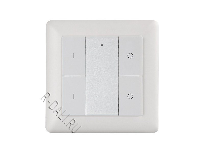 Push button DALI control panel SR-2422K4-DIM-G2 is a single color DALI controller that controls 2 group addresses. The groups of devices on DALI circuit to be controlled can be assigned manually by rotary switch on the back. All DALI devices on the circuit can be controlled by the panel through broadcast. The DALI panel enables to switch on/off and increase/decrease light intensity of the groups. It is easy to use and no configuration by computer required. The DALI controller can be compatible with all universal DALI master controllers. Compatible with existing standard size frames from Berker, Merten, Gira, the DALI push button controller can be wall mounted easily.
