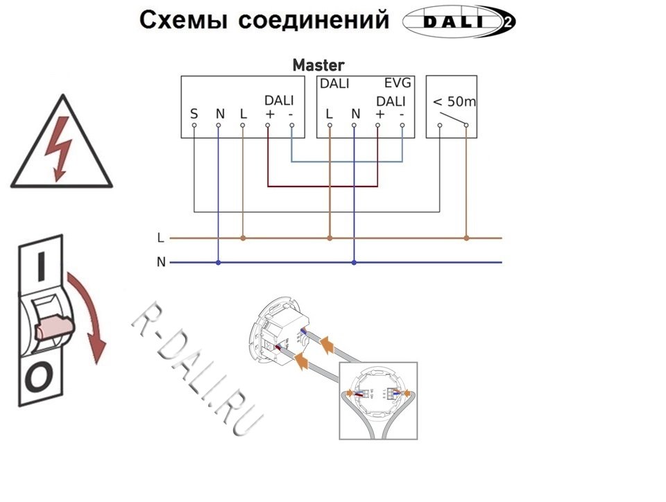 | DALI | Выход DALI: 2-полюсная управляющая линия DALI; одно ведущее устройство (single master), Application controller / broadcast |
