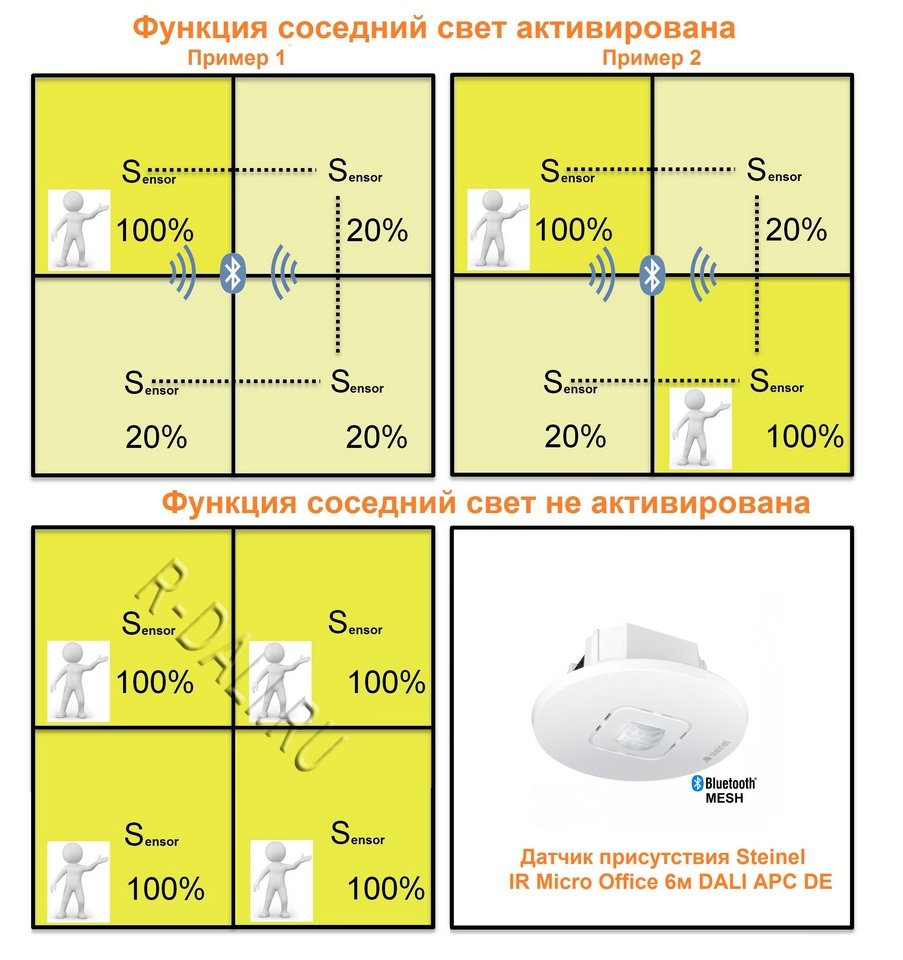 | Функция соседства | С помощью функции соседства соседние группы закрепляются за активной группой датчиков. Группа реагирует на сигналы включения от закрепленной за ней соседней группы и переключается в соответствии с настройками. |