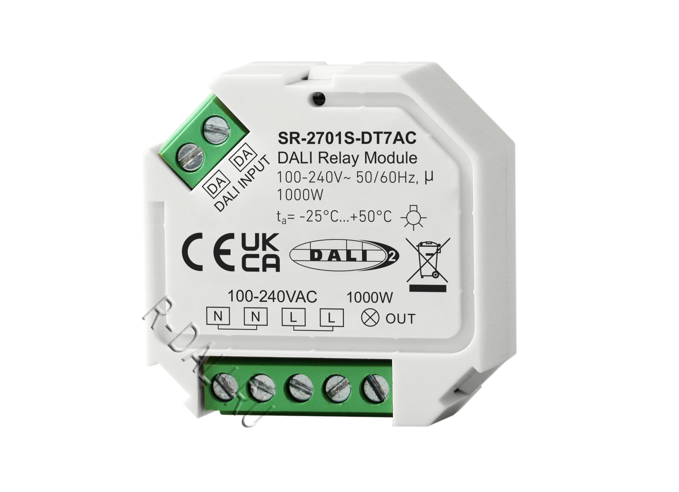 The DALI-2 relay module is designed to integrate non-DALI devices into a DALI circuit. It supports a wide input voltage range of 100-240VAC and is compatible with both DALI and DALI-2 versions, ensuring versatility and adaptability. The module allows for easy assignment of a DALI address via the DALI master controller and complies with the IEC 62386-208 standard. It features a single channel actuator (switch) with DALI-2 input and incorporates key safety features such as zero-crossing detection, overload, and short circuit protection. Its compact design enables simple installation into a standard wall box. As a compliant DALI device type 7, the module comes with a 5-year warranty and is rated with an IP20 waterproof grade.