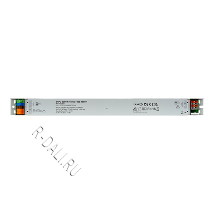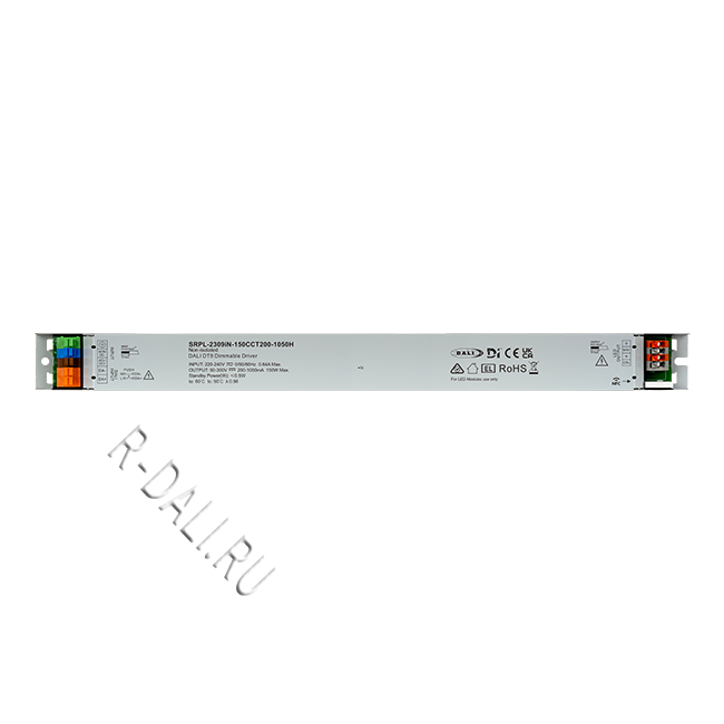 SRPL-2309iN-150CCT200-1050H  линейный диммируемый светодиодный драйвер мощностью 150 Вт в удлиненном металлическом корпусе, сертифицированный по стандарту D4i DT8. Это драйвер без изоляции безопасности (Non-SELV), требующий соблюдения дополнительных мер защиты при установке. Выполнен с двумя каналами постоянного выходного тока, регулируемого в диапазоне от 200 мА до 1050 мА, что обеспечивает совместимость со светодиодными светильниками, требующими различного тока. Рассчитан на входное напряжение 220-240 В перем. тока. Коэффициент мощности драйвера превышает 0.98, а КПД — более 90%. Обеспечивает плавное и глубокое диммирование до 0.1% без мерцания и акустического шума.