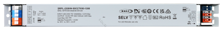 SRPL-2309iN-50CCT650-1300  линейный диммируемый светодиодный драйвер мощностью 50 Вт в металлическом корпусе, сертифицированный по стандартам D4i & DALI-2. Выполнен с двумя каналами постоянного выходного тока, регулируемого в диапазоне от 650 мА до 1300 мА, что обеспечивает совместимость со светодиодными светильниками, требующими различного тока. Рассчитан на входное напряжение 220-240 В перем. тока / 176-280 В пост. тока. Коэффициент мощности драйвера превышает 0.97, а КПД — более 88%. Обеспечивает плавное и глубокое диммирование до 0.01% без мерцания и акустического шума. Один адрес DALI для двух выходных каналов может быть назначен с помощью приложения "SR NFC Tool" или автоматически — ведущим устройством (мастером) DALI. Соответствуя стандартам IEC 62386-101:2014, IEC 62386-102:2014, IEC 62386-207 Ed2, IEC 62386-209, данный драйвер совместим с сертифицированными по DALI-2 прикладными контроллерами и устройствами управления.