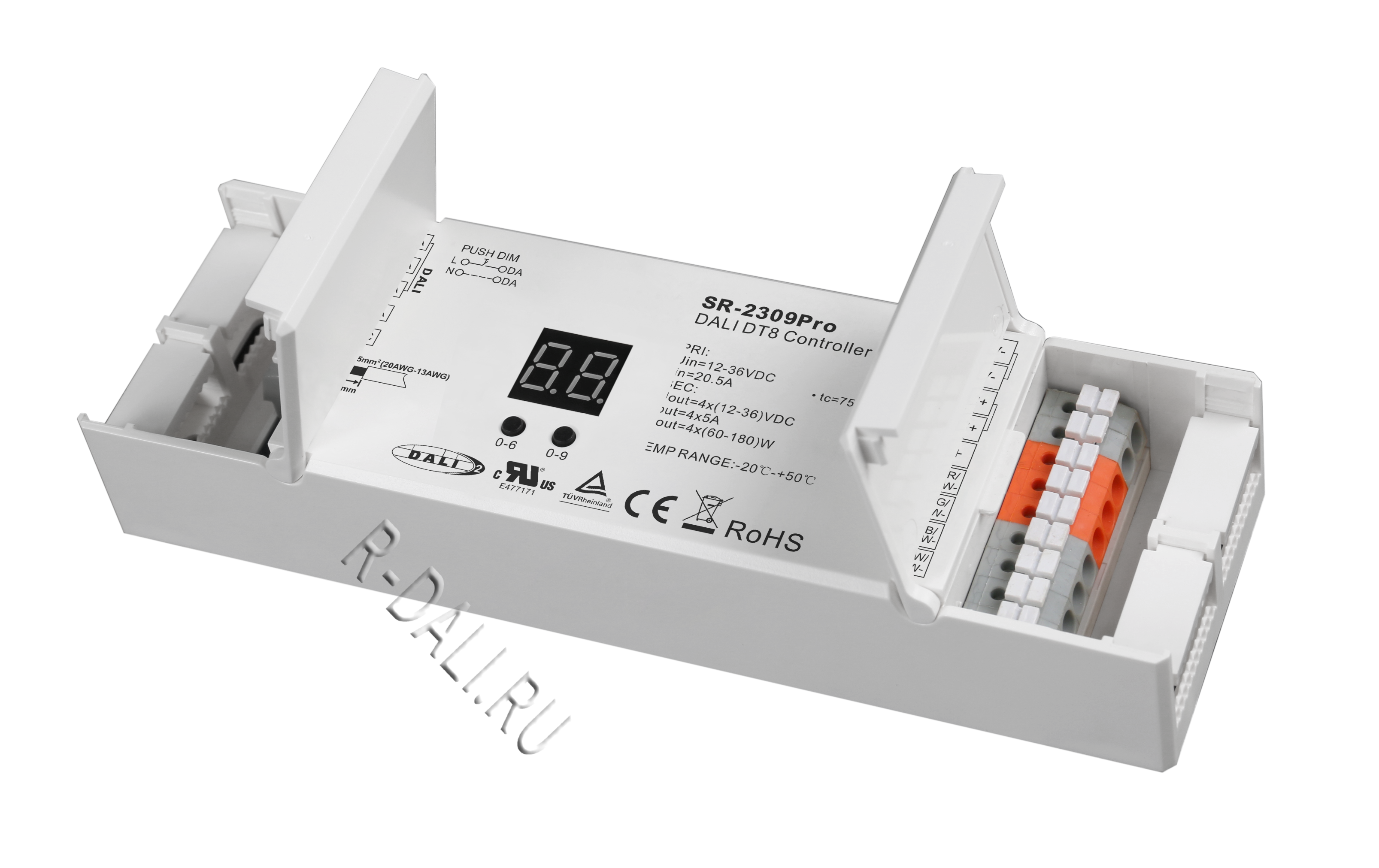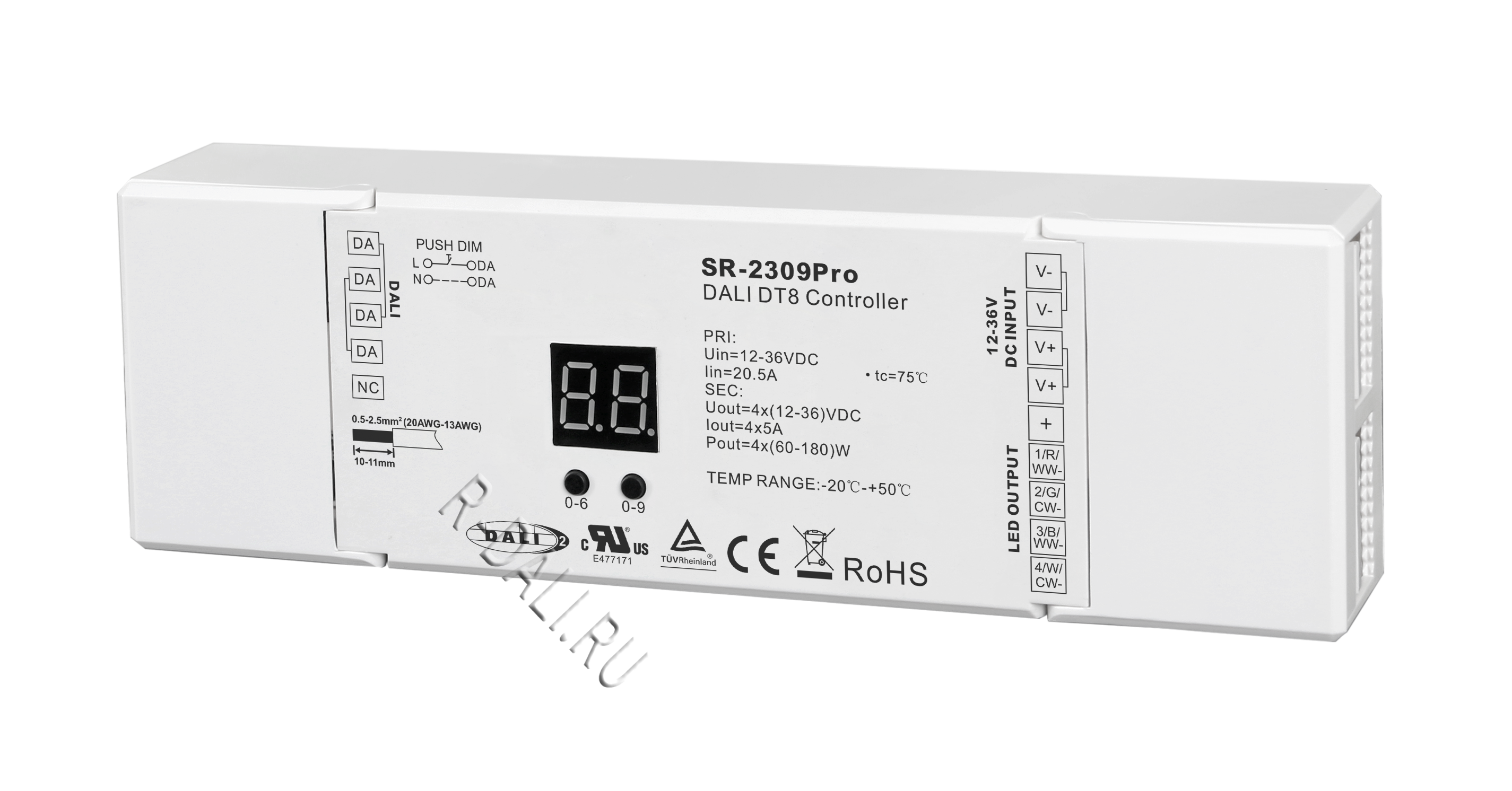 SR-2309PRO is a 6 in 1 professional multi-functional enabled DALI DT8 control gear which is compliance with IEC 62386-101:2014, IEC 62386-102:2014, IEC 62386-207 Ed2, IEC 62386-209:2011. It is DALI DT8 device with built-in DALI-2 interface. Multi addresses are enabled in this control gear, which means it integrates multi DALI DT8 devices in on control gear. It can be set as single address type or multi-addresses type. The combination of device types can be configured with the buttons and display, and total 6 combinations available: Tc, RGBWAF, XY, 2*Tc, XY+W (DT6),DT6.