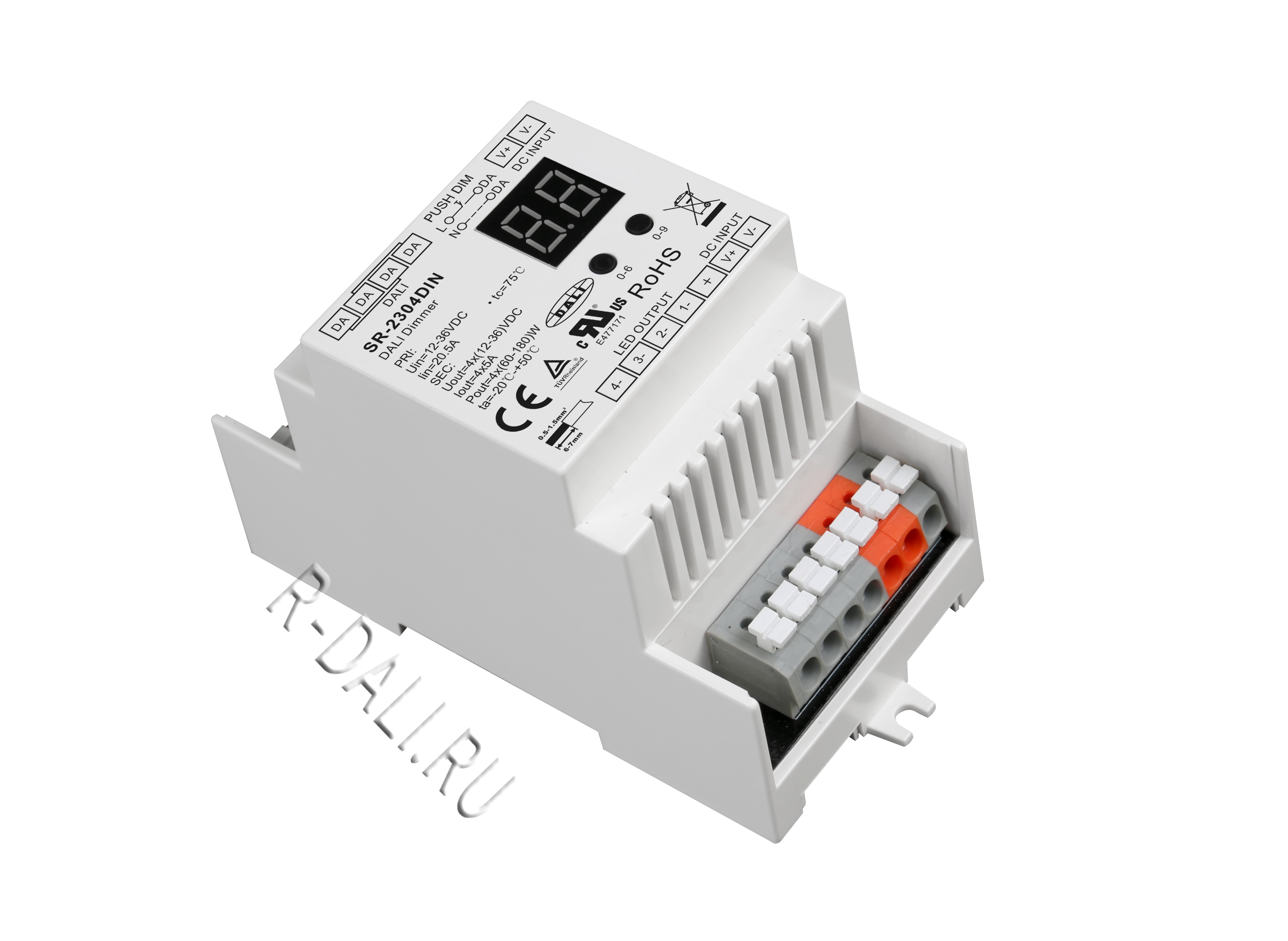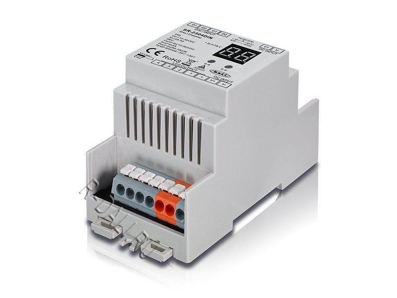 The DALI Dimmer SR-2304DIN is a din rail mounted DALI controller that complies with standard DALI protocol and can be compatible with both DALI master and push button switch without DALI signal, which means it can receive both DALI signal and push signal. The DALI dimmer comes with constant voltage output and available in 12VDC, 24VDC and 36VDC. The DALI address can be manually assigned and shown on the numeric digital display or automatically assigned by master controllers. 1-4 DALI addresses can be configurable for 4 channels to work synchronously or separately. 0.1%-100% smooth dimming can be achieved by the DALI dimmer via logarithmic dimming, which is perfect for human's vision.