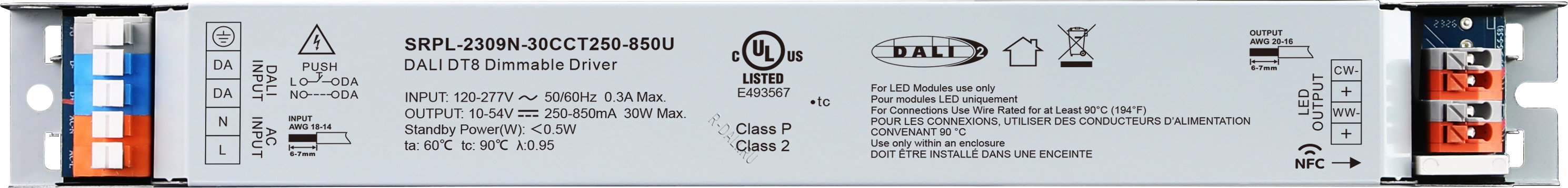 SRPL-2309N-30CCT250-850U is a DALI-2 certified linear metal casing 30W dimmable LED driver. It is designed with 2 channels constant current output with adjustable current from 250mA to 850mA, which enables it to be suitable for LED lights with different current. It is designed with 120-277VAC input. Power factor of the driver can be over 0.95 and efficiency is higher than 85%. It enables smooth and deep dimming to 0.01% without flickering and buzzing noise. One DALI address for two channels output can be manually assigned via "SR NFC Tool" APP or automatically assigned by DALI masters. Complying with IEC 62386-101:2014, IEC 62386-102:2014, IEC 62386-207 Ed2, IEC 62386-209, this DALI driver is compatible with DALI-2 certified application controllers and control devices.