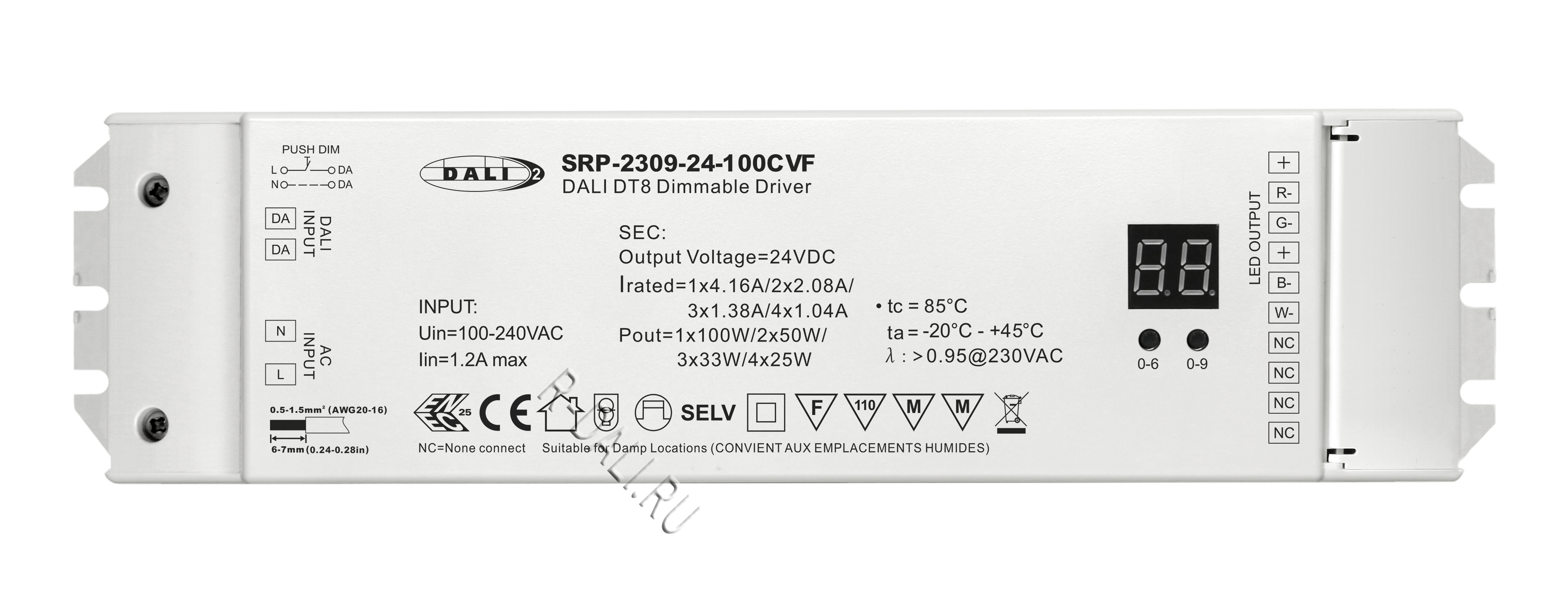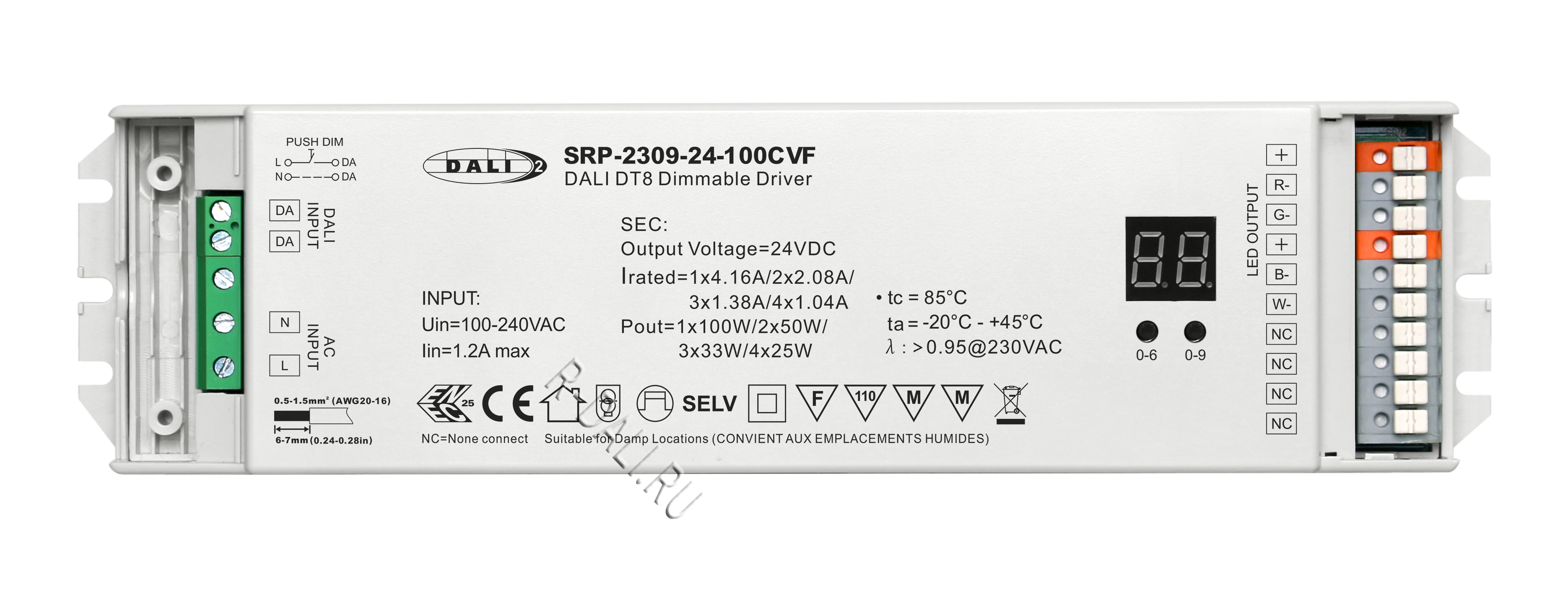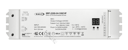 SRP-2309-24-100CVF is a DALI-2 certified 100W LED driver with 4 parallel connected channels with 2 common anodes and 24VDC constant voltage output. It is designed with 100-240VAC universal input. Power factor of the driver can be over 0.9 and efficiency is higher than 90%. It enables smooth and deep dimming to 0.1% without flickering and buzzing noise. 1 DALI address can be manually assigned via buttons and showed on digital display or automatically assigned by DALI masters. TUV and ENEC approval ensure safe and reliable performance of this driver. Complying with IEC62386-101:2014, 102:2014, 207 ed.2, this DALI driver is compatible with DALI-2 certified application controllers and control devices.