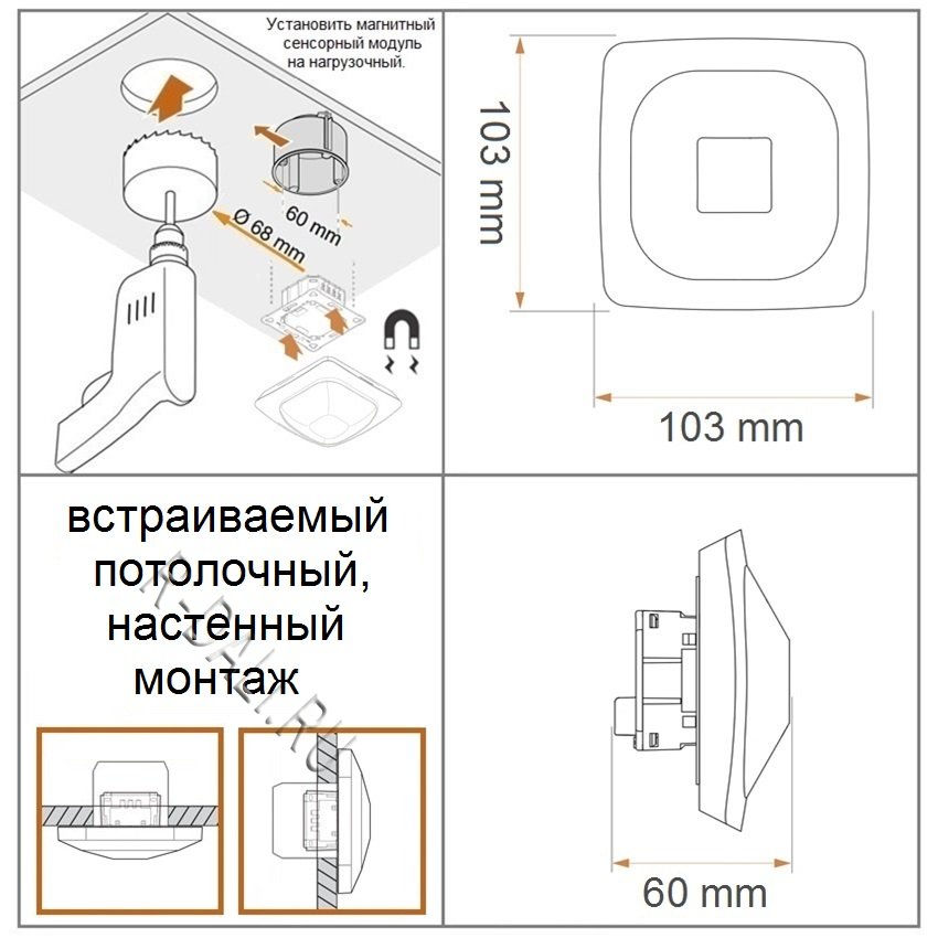 | Установка | внутренний, потолочный, настенный, встраиваемый монтаж в подрозетник диаметром 68мм. |