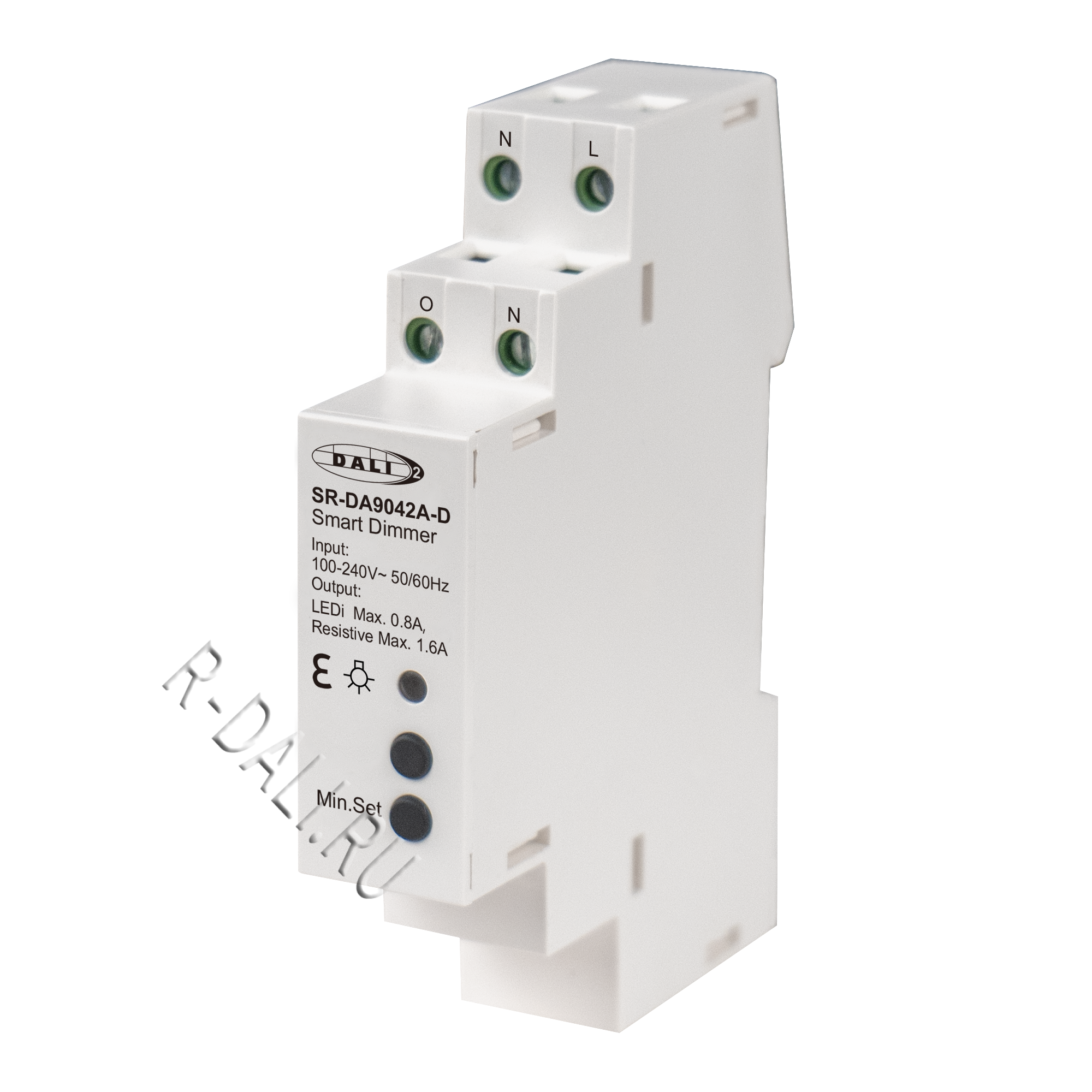 The SR-DA9042A-D is a DALI DIN Rail AC phase-cut dimmer supporting 100–240VAC input/output. It handles resistive, capacitive, or inductive loads up to 400W with 1-channel output. Available in leading or trailing edge versions, it offers reliable ON/OFF and dimming control via screw terminals.