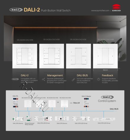 The wall switch SR-2422K6-DA2-WSK is industry first DALI-2 certified DALI-2 control device with 6 push buttons according to IEC62386-101, IEC62386-103, IEC62386-301 and IEC62386-332. The input device supports feedback functionality and provides 12 LEDs. It is suitable for integration and in combination with DALI-2 compliant central control units. The push button device is multimaster capable, multiple modules can be installed on the DALI- line. The DALI-2 input device is DALI bus powered, no extra power supply required. It is easily configurable via DALI-2 compliant central controller USB interface.
