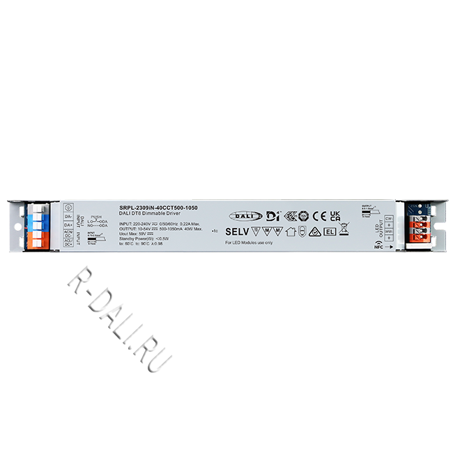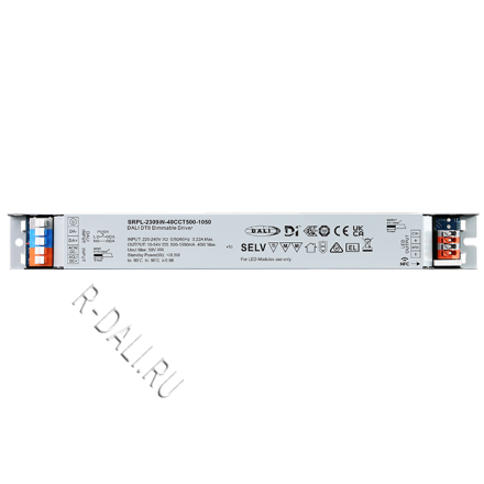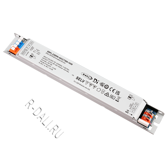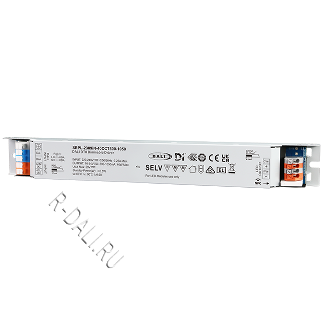 SRPL-2309iN-40CCT500-1050 линейный диммируемый светодиодный драйвер мощностью 40 Вт в металлическом корпусе, сертифицированный по стандартам D4i & DALI-2. Выполнен с двумя каналами постоянного выходного тока, регулируемого в диапазоне от 500 мА до 1050 мА, что обеспечивает совместимость со светодиодными светильниками, требующими различного тока. Рассчитан на входное напряжение 220-240 В перем. тока / 176-280 В пост. тока. Коэффициент мощности драйвера превышает 0.98, а КПД — более 87%. Обеспечивает плавное и глубокое диммирование до 0.01% без мерцания и акустического шума. Один адрес DALI для двух выходных каналов может быть назначен с помощью приложения "SR NFC Tool" или автоматически — ведущим устройством (мастером) DALI. Соответствуя стандартам IEC 62386-101:2014, IEC 62386-102:2014, IEC 62386-207 Ed2, IEC 62386-209, данный драйвер совместим с сертифицированными по DALI-2 прикладными контроллерами и устройствами управления.