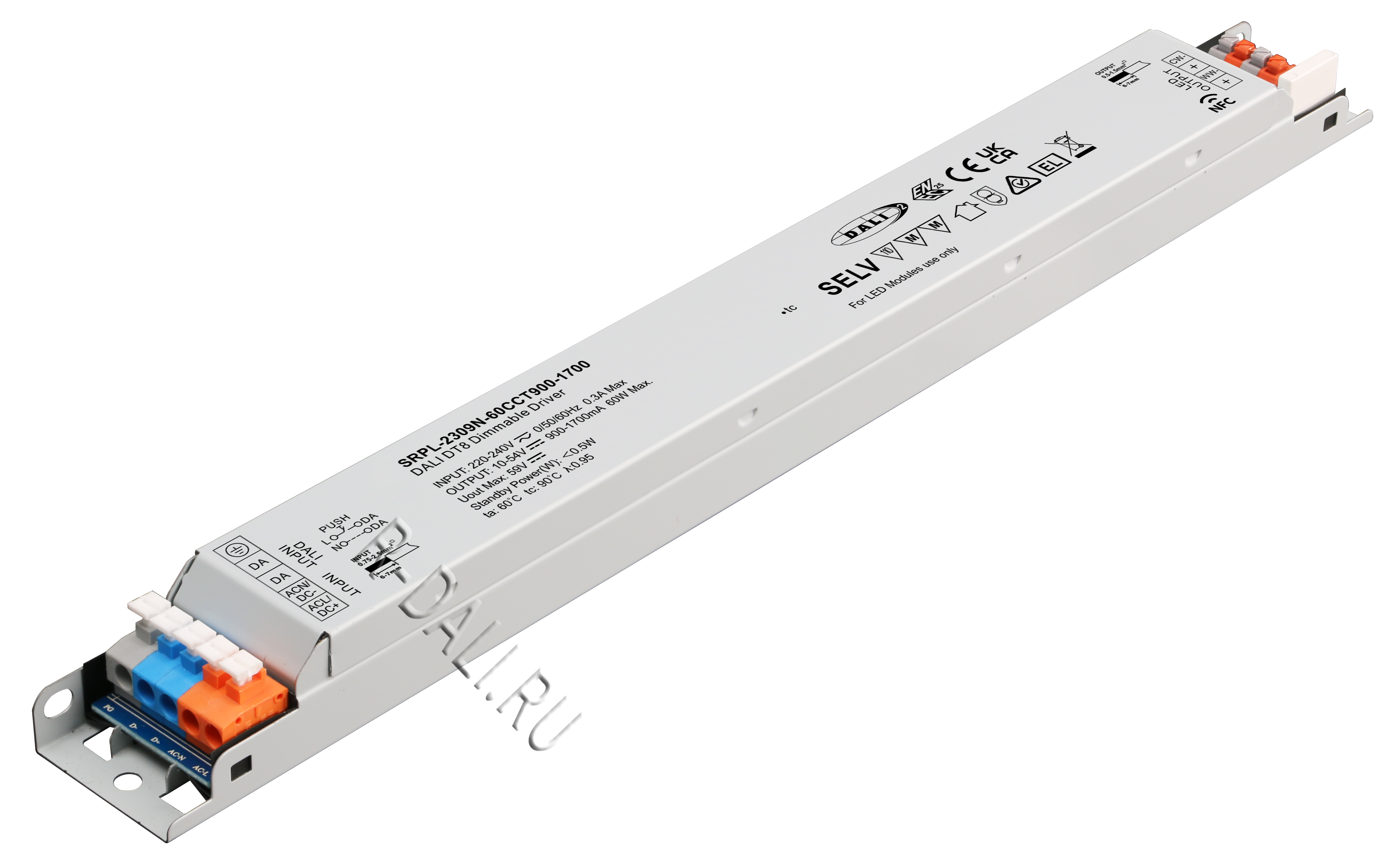 SRPL-2309N-60CCT900-1700 is a DALI-2 DT8 certified long metal casing 60w dimmable LED driver. It is designed with 1 channel constant current output with adjustable current from 900mA to 1700mA, which enables it to be suitable for LED lights with different current. It is designed with 220-240VAC input. Power factor of the driver can be over 0.96 and efficiency is higher than 85%. It enables smooth and deep dimming to 0.1% without flickering and buzzing noise. 1 DALI address can be manually assigned via buttons and showed on digital display or automatically assigned by DALI masters. Complying with IEC62386-101:2014, 102:2014, 207 ed.2, this DALI driver is compatible with DALI-2 certified application controllers and control devices.