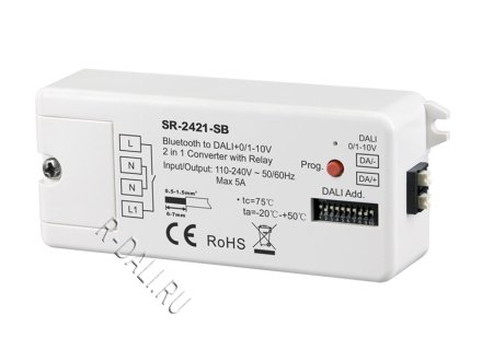 SR-2421-SB is a Bluetooth DALI interface & Bluetooth 0-10V/1-10V interface that receives bluetooth signal and can be controlled through smart APP and RF remote. The controller converts the wireless signal to DALI and 0-10V/1-10V. The DALI mode or 0-10V/1-10V mode can be selected through dip switch. Under DALI mode, It is a DALI controller powered by 110-240VAC and with 50mA DALI bus power output to control up to 25 DALI control gears. The wilress DALI controller is ultra powerful to control DALI DT6, DT8 tunable white, DT8 XY coordinate, DT8 RGBWAF control gears and can be compatible with DALI products from other international incorporations.