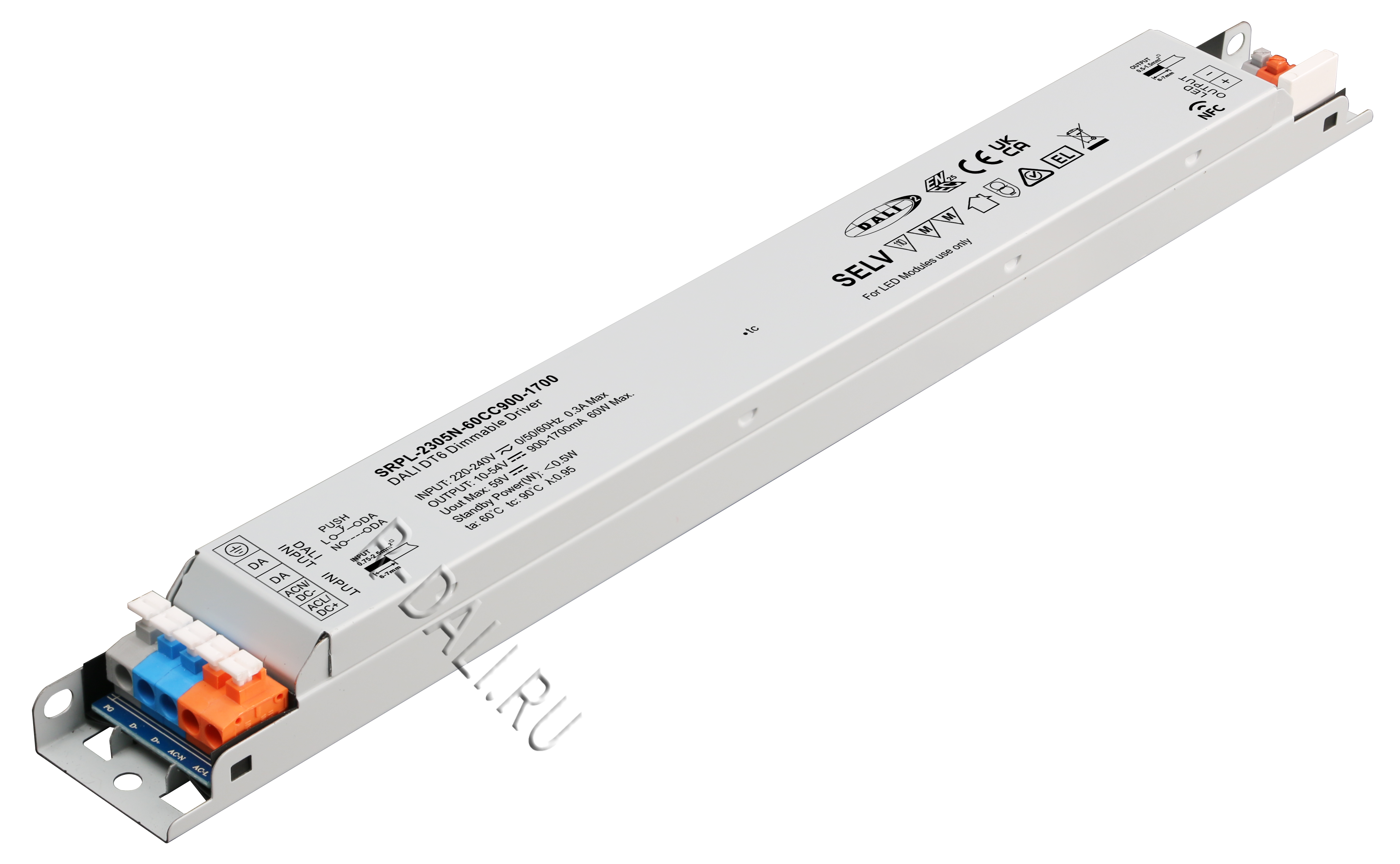 SRPL-2305N-60CC900-1700 is a DALI-2 DT6 certified long metal casing 60w dimmable LED driver. It is designed with 1 channel constant current output with adjustable current from 900mA to 1700mA, which enables it to be suitable for LED lights with different current. It is designed with 220-240VAC input. Power factor of the driver can be over 0.96 and efficiency is higher than 85%. It enables smooth and deep dimming to 0.1% without flickering and buzzing noise. 1 DALI address can be manually assigned via buttons and showed on digital display or automatically assigned by DALI masters. Complying with IEC62386-101:2014, 102:2014, 207 ed.2, this DALI driver is compatible with DALI-2 certified application controllers and control devices.