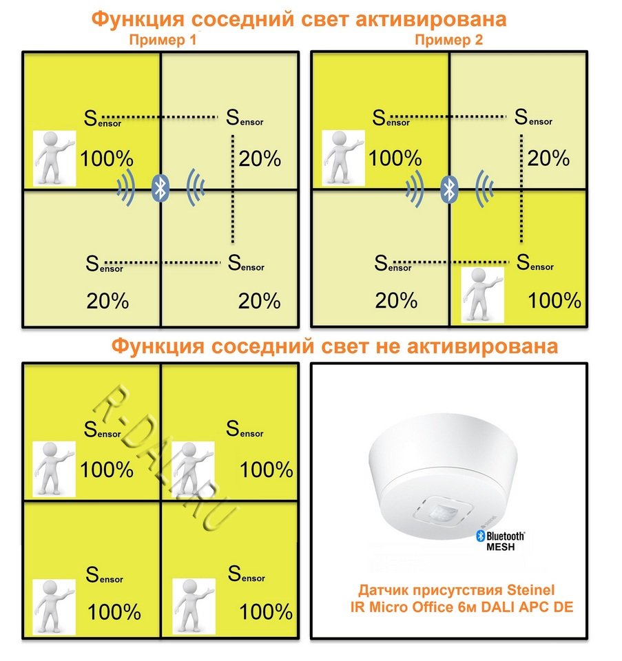 | Функция соседства | С помощью функции соседства соседние группы закрепляются за активной группой датчиков. Группа реагирует на сигналы включения от закрепленной за ней соседней группы и переключается в соответствии с настройками. |