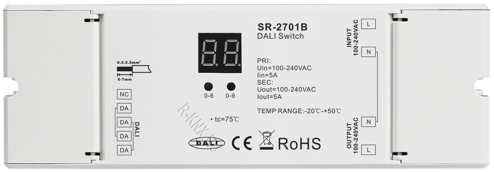 The DALI switch SR-2701B is a DALI controller that complies with standard DALI protocol and can be compatible with DALI products from other international corporations. The DALI switch is designed with AC inout and AC output. The DALI address can be manually assigned and shown on the numeric digital display or automatically assigned by master controllers. The DALI master device can control power on/off to cater for unwanted dimming lighting system.