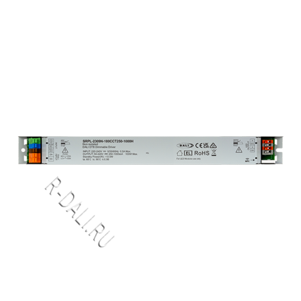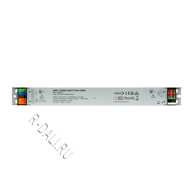 SRPL-2309N-100CCT250-1000H — это сертифицированный по стандарту DALI-2 DT8 длинный безопасный сверхнизкого напряжения (Non-SELV) NFC-диммируемый LED-драйвер в металлическом корпусе мощностью 100 Вт. Он разработан с двумя каналами постоянного тока с регулируемым выходным током от 250 мА до 1000 мА каждый, что делает его подходящим для светодиодных светильников с различными требованиями к току. Драйвер рассчитан на входное напряжение 220-240 В перем. тока. Коэффициент мощности драйвера может превышать 0,98, а КПД — более 90%. Он обеспечивает плавное и глубокое диммирование до 0,1% без мерцания и гудения.