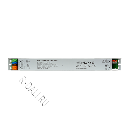 SRPL-2305iN-80CC350-700H линейный диммируемый светодиодный драйвер мощностью 80 Вт в удлиненном металлическом корпусе, сертифицированный по стандарту D4i DT6. Это драйвер без изоляции безопасности (Non-SELV), требующий соблюдения дополнительных мер защиты при установке. Выполнен с одним каналом постоянного выходного тока, регулируемого в диапазоне от 350 мА до 700 мА, что обеспечивает совместимость со светодиодными светильниками, требующими различного тока. Рассчитан на входное напряжение 220-240 В перем. тока. Обеспечивает плавное и глубокое диммирование до 0.1% без мерцания и акустического шума.