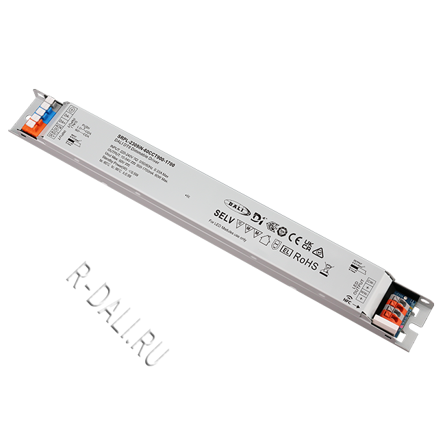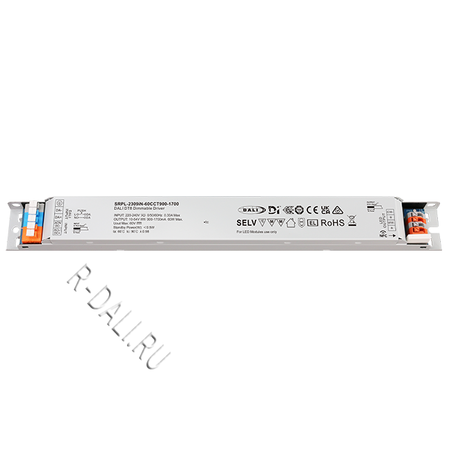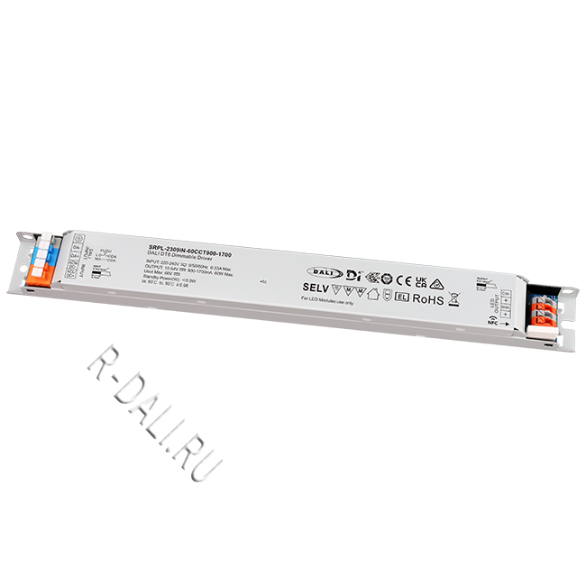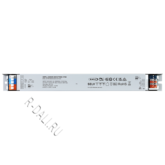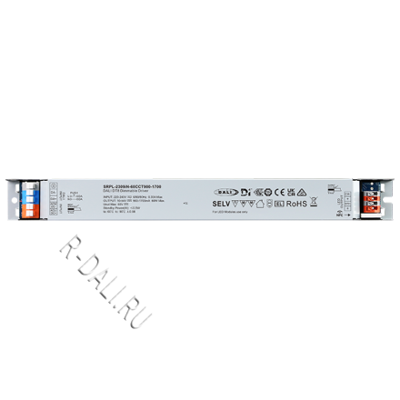 SRPL-2309iN-60CCT900-1700  линейный диммируемый светодиодный драйвер мощностью 60 Вт в металлическом корпусе, сертифицированный по стандартам D4i & DALI-2. Выполнен с двумя каналами постоянного выходного тока, регулируемого в диапазоне от 900 мА до 1700 мА, что обеспечивает совместимость со светодиодными светильниками, требующими различного тока. Рассчитан на входное напряжение 220-240 В перем. тока / 176-280 В пост. тока. Коэффициент мощности драйвера превышает 0.98, а КПД — более 87%. Обеспечивает плавное и глубокое диммирование до 0.01% без мерцания и акустического шума. Один адрес DALI для двух выходных каналов может быть назначен с помощью приложения "SR NFC Tool" или автоматически — ведущим устройством (мастером) DALI. Соответствуя стандартам IEC 62386-101:2014, IEC 62386-102:2014, IEC 62386-207 Ed2, IEC 62386-209, данный драйвер совместим с сертифицированными по DALI-2 прикладными контроллерами и устройствами управления.