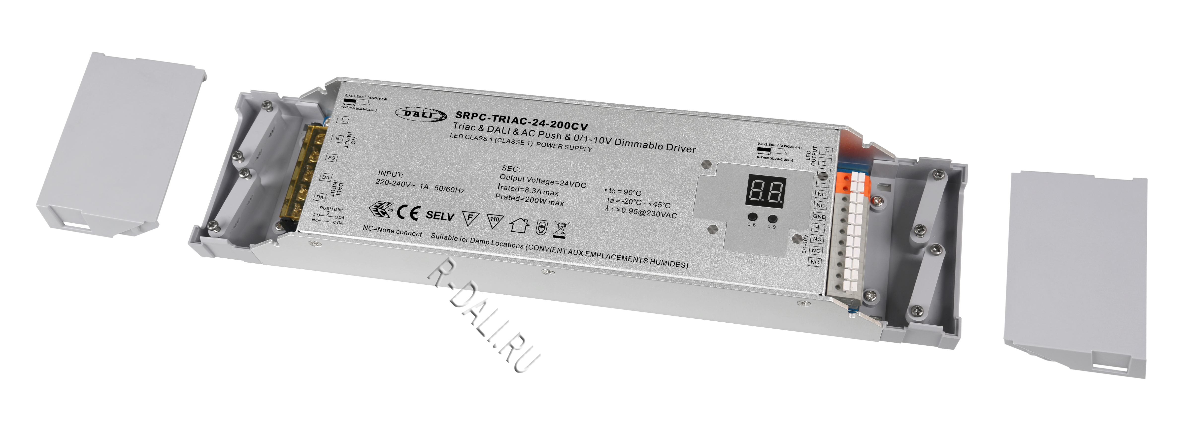 SRPC-TRIAC-24-200CV is an ENEC approved 200W triac dimmable LED driver with 1 channel 24VDC constant voltage output.. It is designed with 220-240VAC input. The triac dimming driver is designed with DALI, Push, Triac, 0/1-10V 4 dimming interfaces in 1, which enables it to work with different control systems. The LED driver adopts amplitude dimming output instead of PWM output to ensure real flicker free. It enables smooth and deep dimming to 1% without flickering and buzzing noise. 1 DALI address can be automatically assigned by DALI masters. Complying with IEC 62386-101, IEC 62386-102, IEC 62386-207, this DALI driver is compatible with most DALI systems in the market. The Triac dimming driver can be compatible with universal Triac dimmers. While selecting 0/1-10V interface, it is compatible with universal 0/1-10V dimmers.