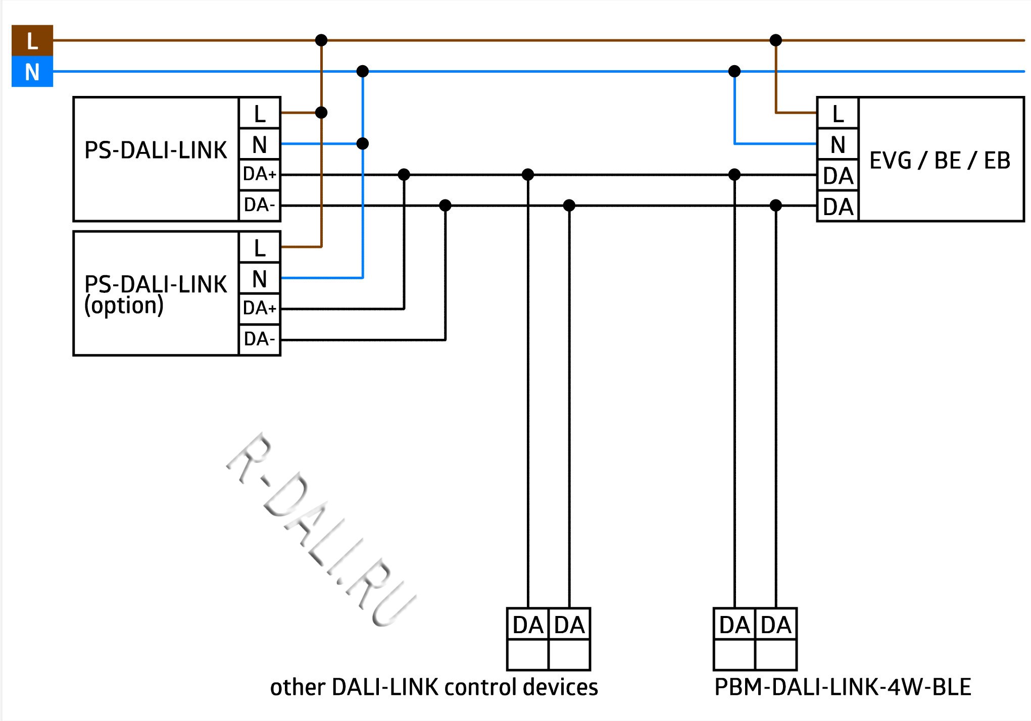 It is possible to operate a maximum of one additional DALI-LINK power supply in parallel, doubling the number of DALI devices in the DALI-LINK system (50 DALI luminaires / 12 DALI-LINK control units).