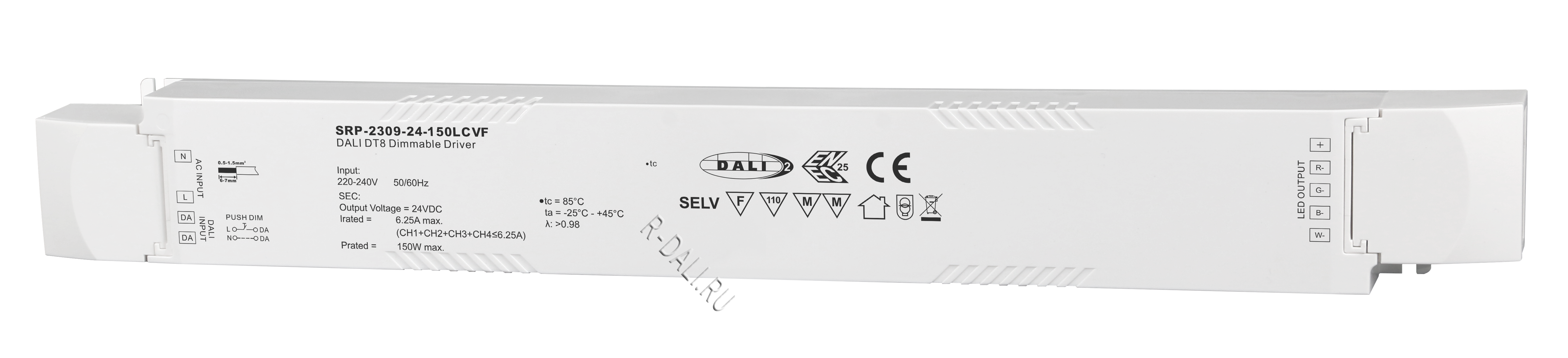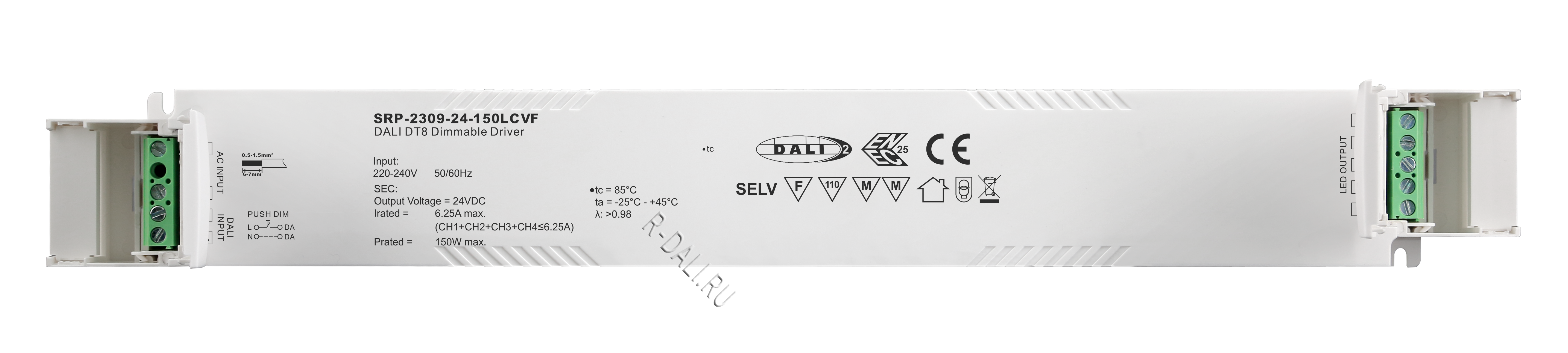 SRP-2309-24-150LCVF  сертифицированный по DALI-2 светодиодный драйвер мощностью 150 Вт с четырьмя параллельно подключенными каналами и постоянным выходным напряжением 24 В постоянного тока. Рассчитан на универсальное входное напряжение 220-240 В перем. тока. Коэффициент мощности драйвера превышает 0.9, а КПД — более 90%. Обеспечивает плавное и глубокое диммирование до 0.1% без мерцания и акустического шума. Один адрес DALI может быть назначен вручную с помощью кнопок и цифрового дисплея или автоматически — ведущим устройством (мастером) DALI. Соответствуя стандартам IEC 62386-101:2014, 102:2014, 207 ed.2, данный драйвер совместим с сертифицированными по DALI-2 прикладными контроллерами и устройствами управления. Сертификация UL и ENEC гарантирует высокий уровень безопасности и надежности для использования по всему миру.