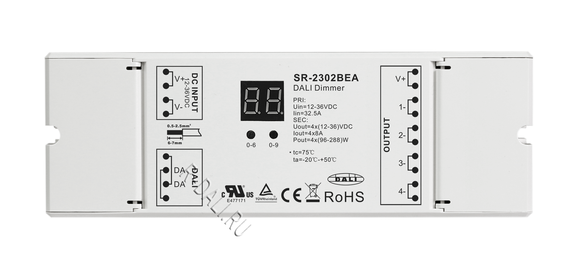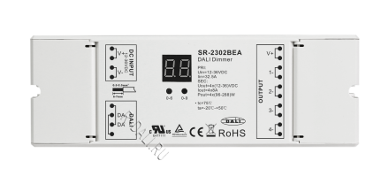 The DALI Dimmer SR-2302BEA is a constant voltage dimming controller with 4 channel, 8A per channel output, which complies to standard DALI protocol with 1 DALI address to control 4 channels synchronously. The DALI address can be manually assigned and shown on the numeric digital display or automatically assigned by master controllers. 1 DALI address is available for 4 channels to work synchronously. 0%-100% smooth dimming can be achieved by the DALI dimmer via logarithmic dimming, which is perfect for human's vision.