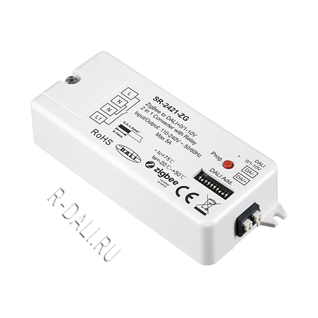 SR-2421-ZG is a Zigbee DALI interface & Zigbee 0-10V/1-10V interface that receives Zigbee signal and can be controlled through universal Zigbee gateways and Zigbee remotes. This Zigbee DALI interface is designed based on Zigbee 3.0 which ensures high interoperability with other manufacturers' Zigbee systems. The controller converts the wireless signal to DALI and 0-10V/1-10V. The DALI mode or 0-10V/1-10V mode can be selected through dip switch. Under DALI mode, It is a DALI controller powered by 100-240VAC and with 50mA DALI bus power output to control up to 25 DALI control gears. The wilress DALI controller is ultra powerful to control DALI DT6, DT8 tunable white, DT8 XY coordinate, DT8 RGBWAF control gears and can be compatible with DALI control gears from other manufacturers.