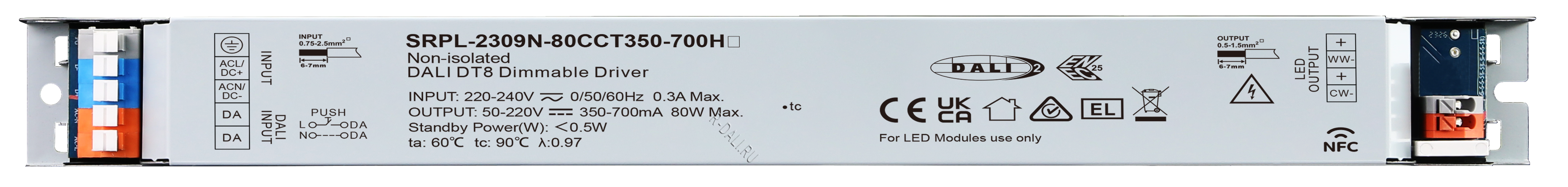 SRPL-2309N-80CCT350-700H is a DALI-2 DT8 certified long metal casing 80w Non-SELV NFC dimmable LED driver. It is designed with 2 channel constant current output with adjustable current from 350mA to 700mA, which enables it to be suitable for LED lights with different current. It is designed with 220-240VAC input. Power factor of the driver can be over 0.98 and efficiency is higher than 91%. It enables smooth and deep dimming to 0.1% without flickering and buzzing noise.